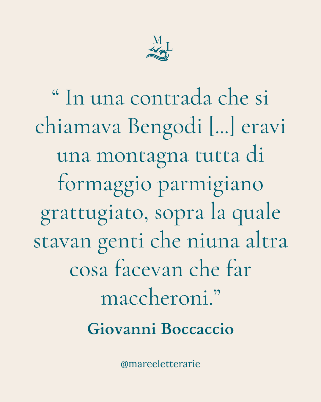 Dal Decameron di Boccaccio nasce una delle immagini più gustose della letteratura italiana: la montagna di parmigiano e maccheroni del Paese di Bengodi. Una visione di abbondanza e fantasia che celebra la gioia del cibo e l’arte tutta italiana di raccontarla.